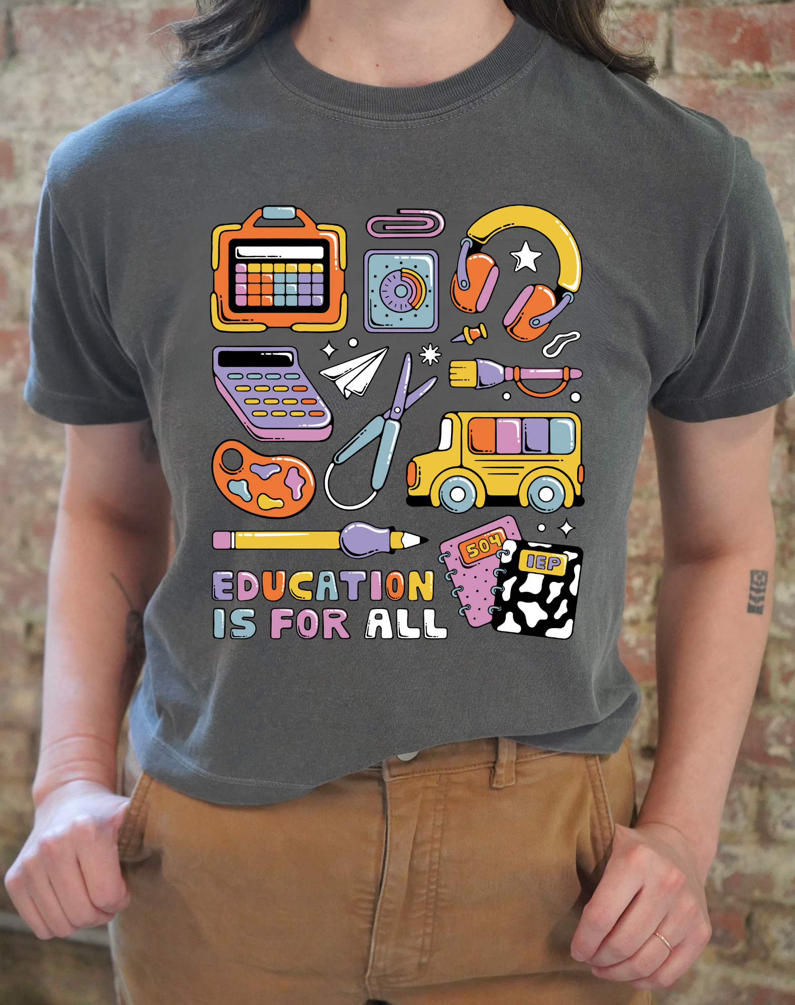 We made this design because we’re watching something sacred get threatened: our children’s right to access education. We know what’s at stake, and we’re not giving up. “Education Is For All” is our reminder and our rally cry. It honors the teachers and therapists staying late to write IEPs, the parents advocating for services, and the kids who deserve to learn in ways that work for them. The design features 504 and IEP folders, adaptive tools, and sensory supports. Every detail in this shirt honors the quiet, determined work it takes to keep accessible education alive. Wear it as a promise: we will keep fighting for every child’s right to an education.